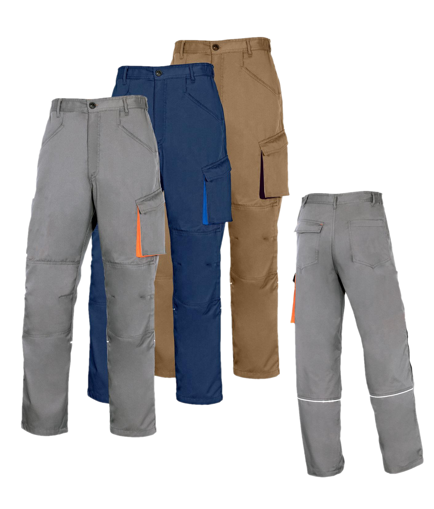 Pantalon de travail 65% Polyester 35% Coton 240 g/m². Taille côtés élastiques. 5 poches. Liseré HV. Changement de couleur sur commande.