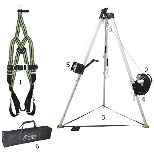 Kit pour espaces confinés composé de : 1 Harnais antichute 2 points d’accrochage avec sangle d’évacuation, réf. FA 10 106 00, 1 antichute à rappel automatique 20 m avec treuil de sauvetage intégré, réf. FA 20 401 20, 1 Trépied (hauteur max. 2,15 m) pour accès en espaces confinés, réf. FA 60 001 00, 1 Kit d’adaptation trépied pour antichute à rappel automatique avec treuil de sauvetage intégré 20 m, réf. FA 60 001 03, 1 Treuil de travail et de sauvetage, câble acier lg. 20 m, réf. FA 60 003 20, 1 Sac de rangement et transport pour Trépied FA 60 001 00, réf. FA 90 108 00.