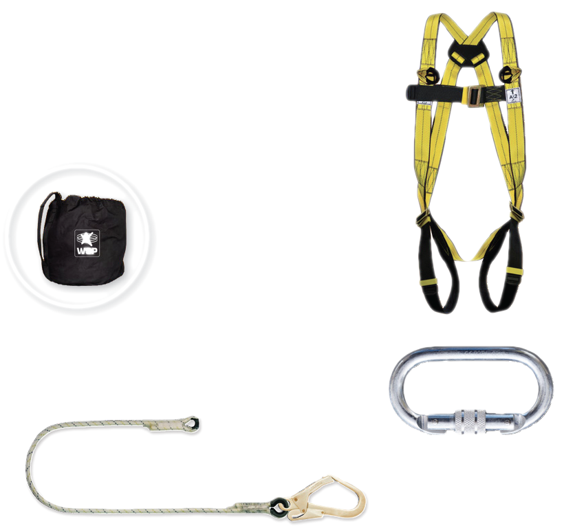 Kit Echafaudeur. Composé de : 1 harnais 2 points d’accrochages (W-FBH 12), 1 longe tressée longueur 1,5 m (W-BRL 288)