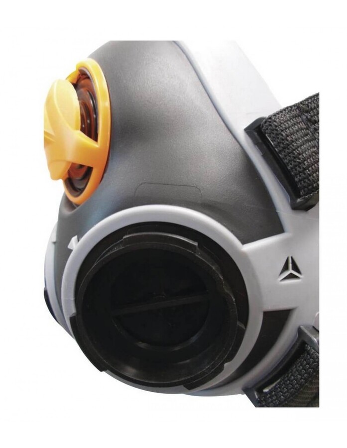 Demi-masque confort bi filtre : Corps du masque en polypropylène (PP) – Surmoulage thermoplastique (TPE). Prévu pour 2 galettes filtrantes de la série M6000 vendues séparément. Lanières élastiques. Emballage sous blister.