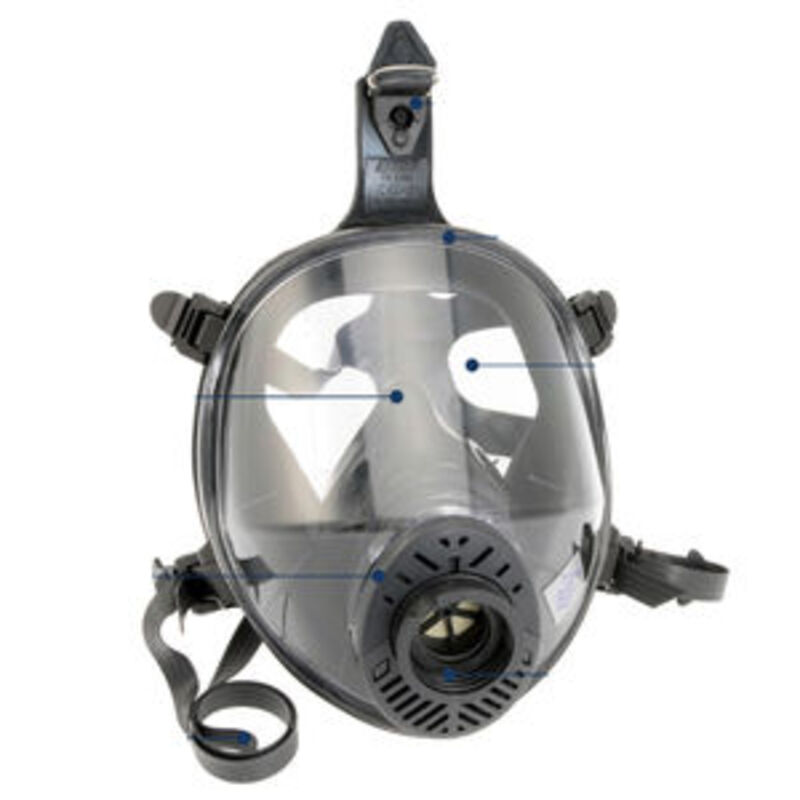 Masque complet TPE/EPDM de classe 3 à pression négative avec raccord fileté 148-1. Oculaire polycarbonate panoramique à grand champs visuel anti-rayure et anti-solvant.